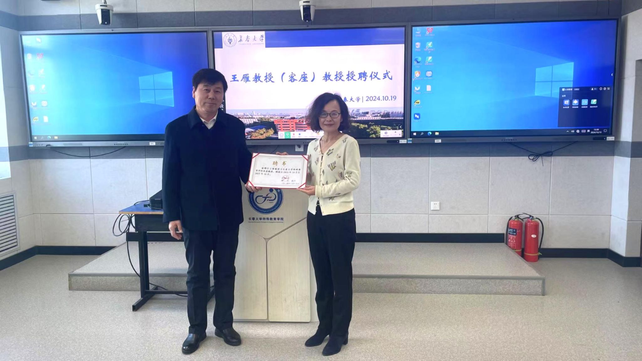 近日,北京师范大学王雁教授被欧冠聘为客座教授。副校长王德军为王雁颁发聘任证书。