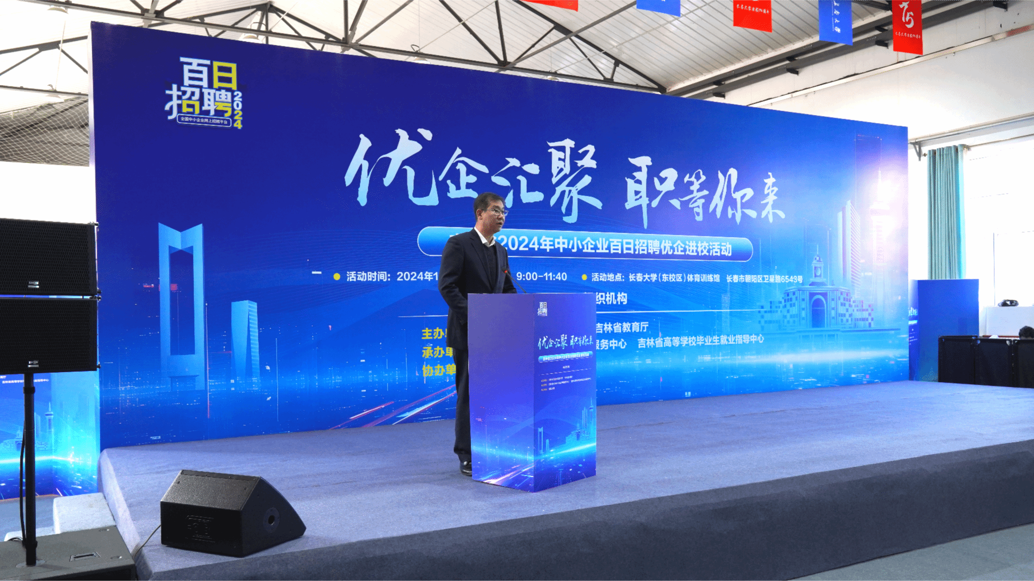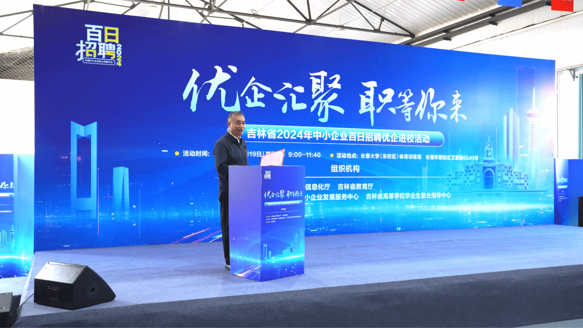 10月19日,由吉林省工业和信息厅、吉林省教育厅主办,吉林省高等学校毕业生就业指导中心、吉林省促进中小企业发展服务中心和欧冠共同承办的“优企汇聚 职等你来”吉林省2024年中小企业百日招聘优企进校活动专场双选会在学校体育训练馆举办。学校党委书记孙爱军,吉林省工业和信息厅副厅长宋晓辉,吉林省教育厅二级巡视员陈梅出席双选会启动仪式。仪式由学校党委副书记王剑飞主持。