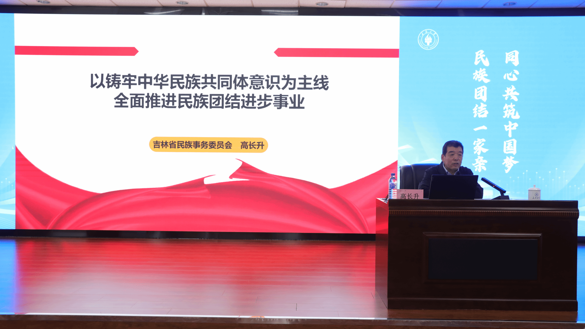 吉林省民族事务委员会二级巡视员高长升作了题为《以铸牢中华民族共同体意识为主线 全面推进民族团结进步事业》的专题讲座。高长升从全面理解铸牢中华民族共同体意识的内涵、深刻认识铸牢中华民族共同体意识的重大意义、切实加强中华民族共同体建设和深入推进民族团结进步事业发展四个方面,以独特的视角、深入的剖析和丰富的实例,具体阐释了铸牢中华民族共同体意识的提出背景、发展进程、重要作用、具体任务和措施路径,为现场师生深刻理解把握铸牢中华民族共同体意识提供了重要的理论与实践指导。