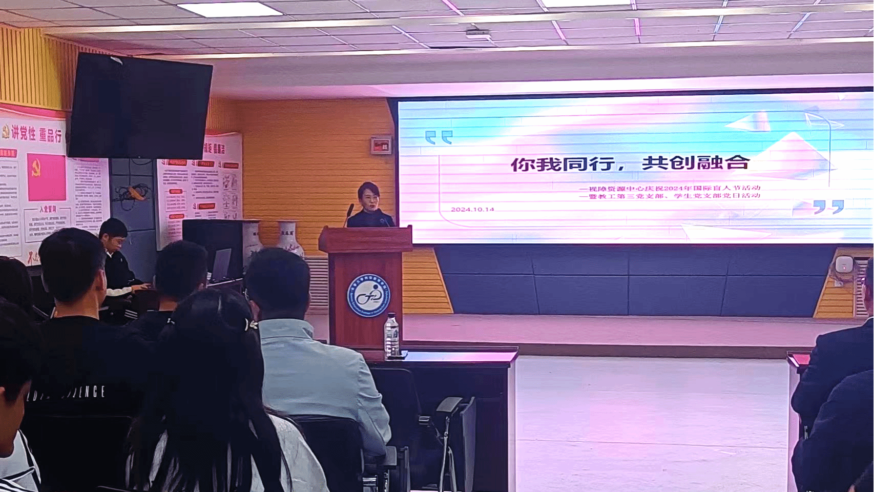 为庆祝第41个国际盲人节,展现视障学生精神面貌,增强社会各界对融合教育的了解,促进残健共融高质量发展,10月14日,特殊教育学院教工第三党支部联合学生党支部举办“你我同行 共创融合”主题党日活动。国家金融监督管理总局吉林监管局消保处处长刘季秀,兴业银行长春分行副行长郑颖寰参加活动。活动由第三党支部书记徐明主持。