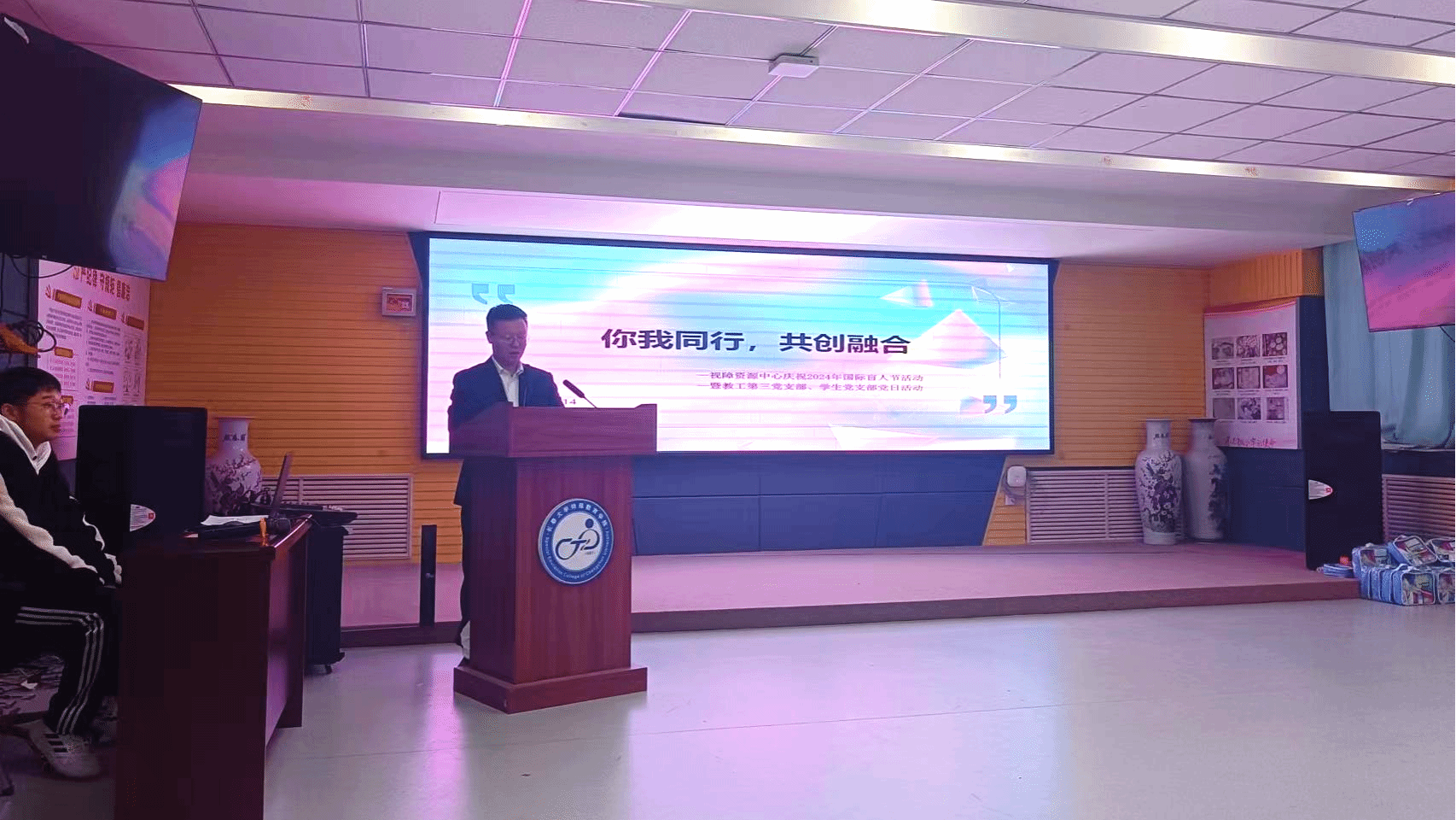 特殊教育学院党委书记刘阳在致辞中介绍了学校党委对残障大学生成长的关注,学院资源中心为融合教育人才培养所作出的努力,呼吁社会各界人士积极走进视障人士生活,关注并支持特殊教育事业的发展。