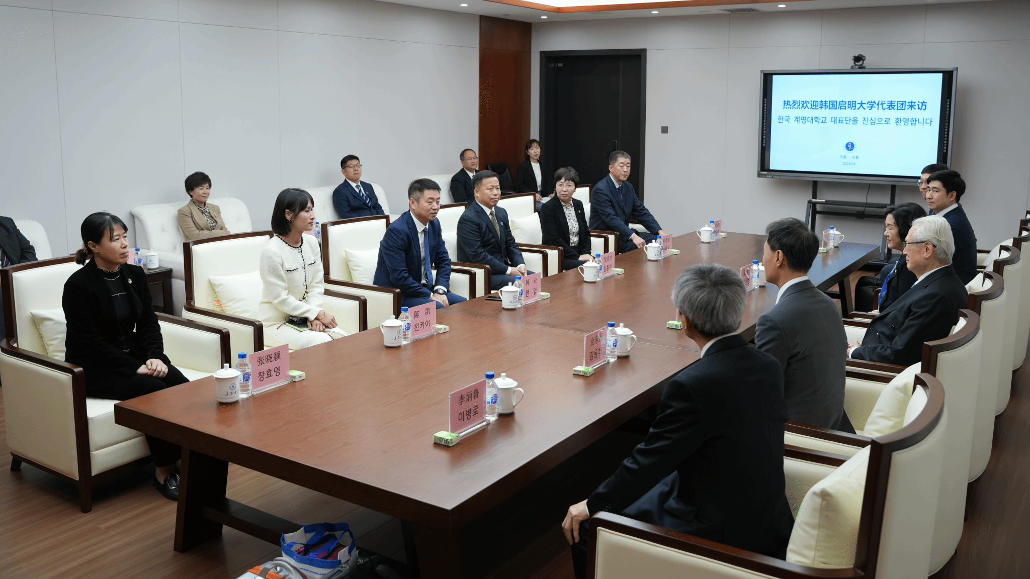 9月25日—28日,韩国启明大学校长申一熙一行访问欧冠,校长韩业、副校长张洪杰参加了会见。