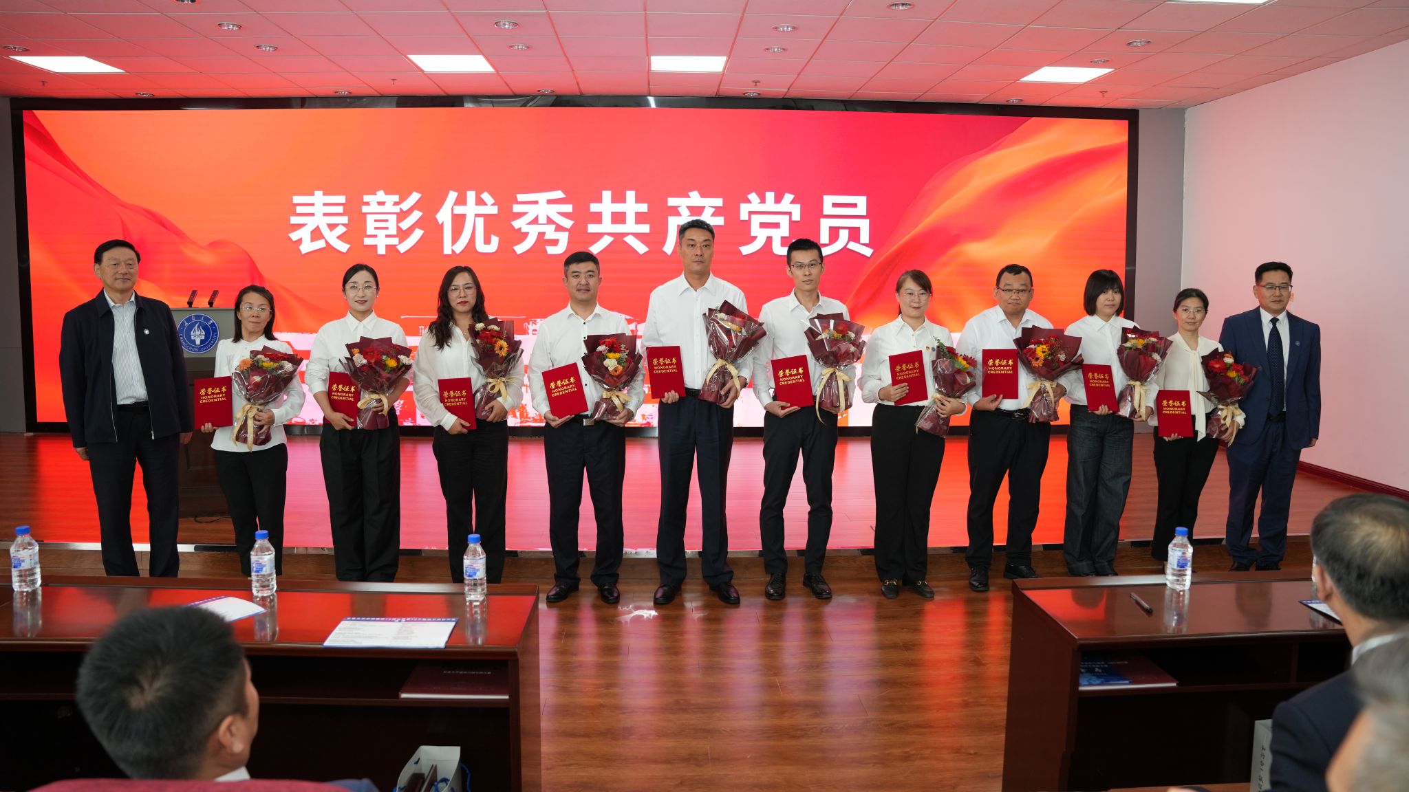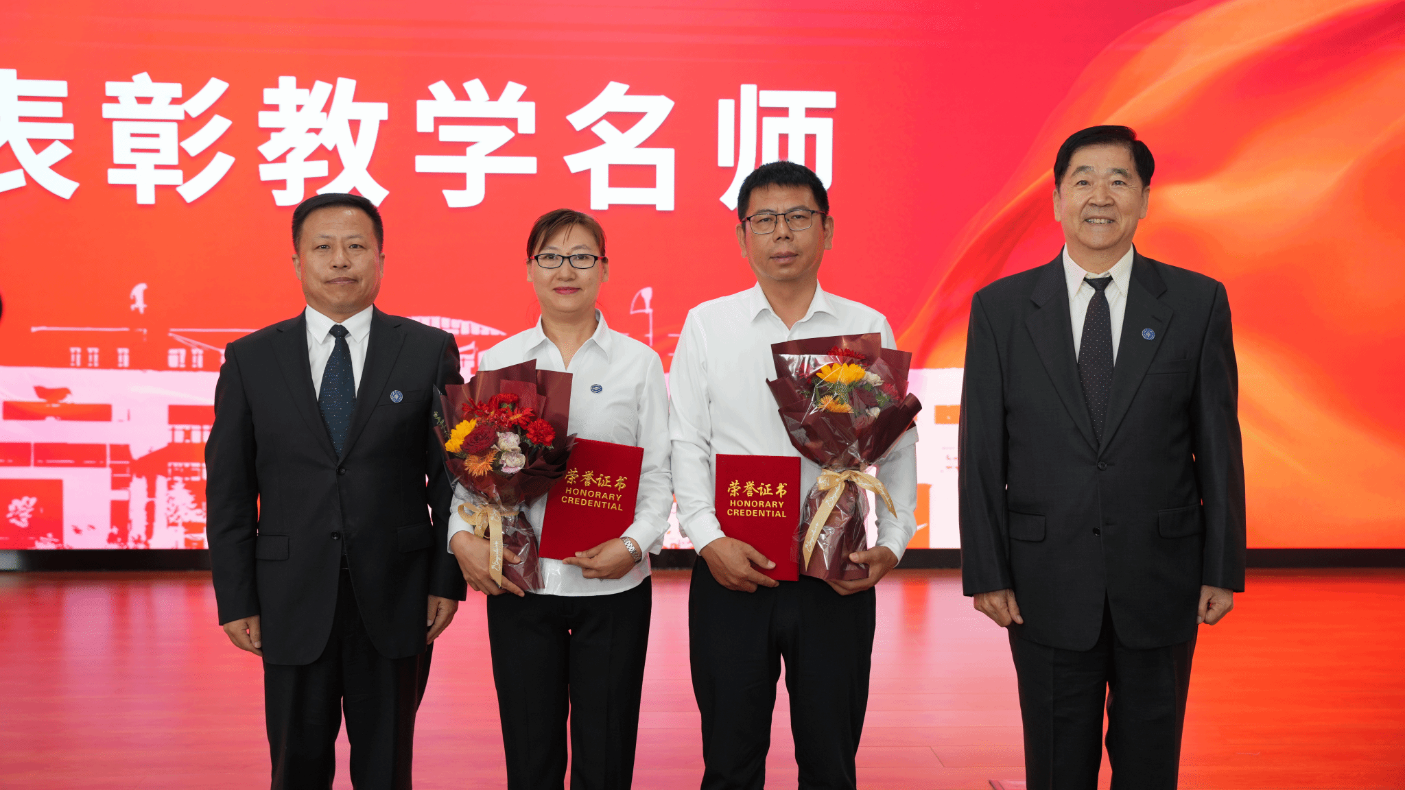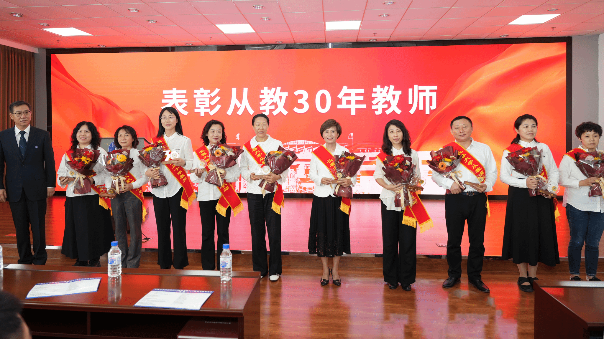 今天,有53名学校教职工完成育人使命,光荣退休。新入职教师代表为荣休教职工代表赠送鲜花。荣休教职工代表为新入职教师代表佩戴校徽。